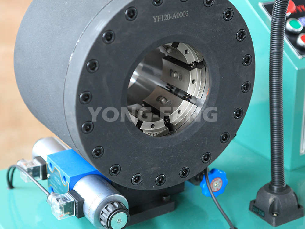 油泵安装于油箱内浸泡在液压油里达到科学散热静音的设计目的,油泵在电机驱动下,输出液压油,推动扣压油缸内的柱塞运动,致使模座径向收缩,实现模具对胶管接头外套的挤压。当收缩量达到千分尺预定值时,挤压自动停止,电磁换向阀换向后,油缸内的柱塞反向运动,模具随之张开,扣压胶管完成。