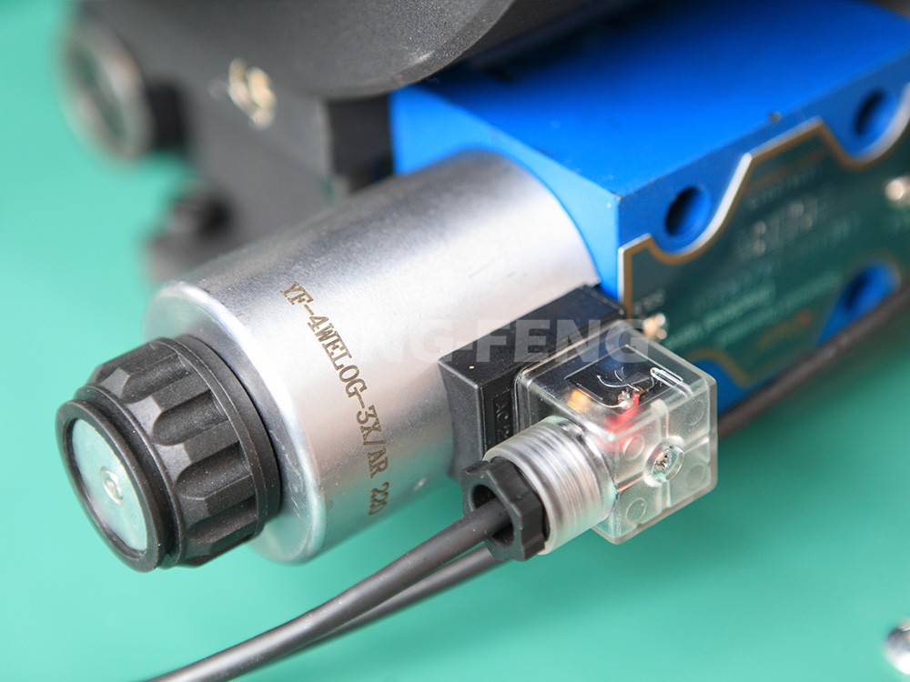 油泵安装于油箱内浸泡在液压油里达到科学散热静音的设计目的,油泵在电机驱动下,输出液压油,推动扣压油缸内的柱塞运动,致使模座径向收缩,实现模具对胶管接头外套的挤压。当收缩量达到千分尺预定值时,挤压自动停止,电磁换向阀换向后,油缸内的柱塞反向运动,模具随之张开,扣压胶管完成。